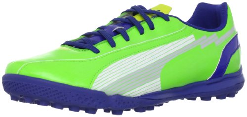 #Quand la vitesse et le confort sont essentiels, la chaussure de foot Evospeed 5 TT de Puma va laisser une traînée destructrice sur les terrains artificiels. Inspirée de la chaussure haut de gamme Evospeed 1, elle utilise le même concept de "légèreté, flexibilité et chaussant" grâce à son empeigne en synthétique doux et résistant. Vous aurez non seulement un toucher de ballon amélioré mais avec un bon maintien et un confort suprême en plus, à un prix abordable. Conçue pour un jeu rapide sur des surfaces artificielles et dures, sa semelle au motif astro grip vous donne l'assurance de performer à votre mieux dans toutes les situations. Conçue pour se distinguer sur le terrain de rugby à plusieurs égards, son coloris vert jasmin est réhaussé de tons plus doux, bleu Monaco et blanc, sur les côtés. Ce thème de couleurs continue sur la semelle pour lui donner continuité. La chaussure de rugby Evospeed 5 de Puma est idéale pour les joueurs en quête de rapidité. *b*Ces chaussures pèsent chacune 285g (Taille UK8 = EUR 42).*b**